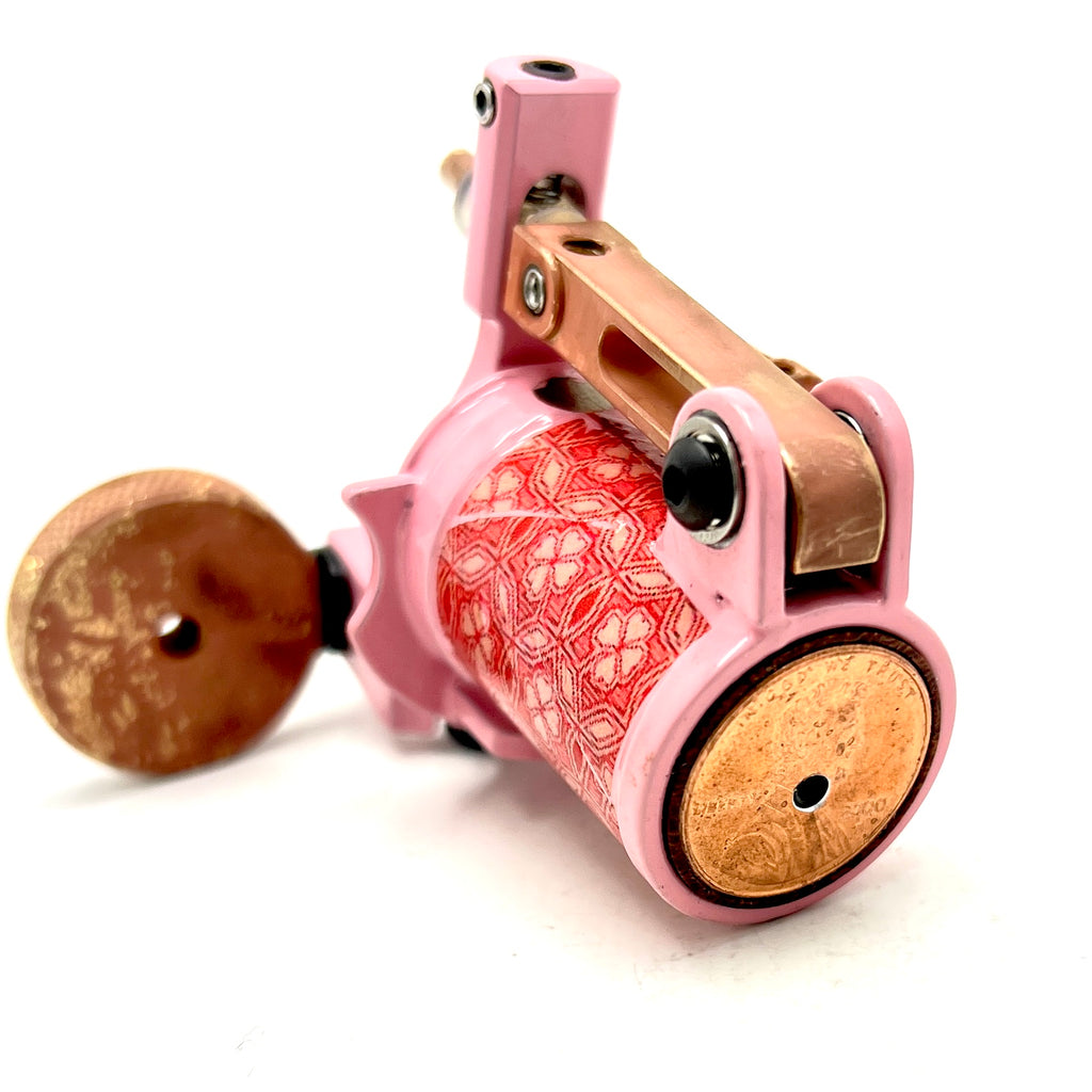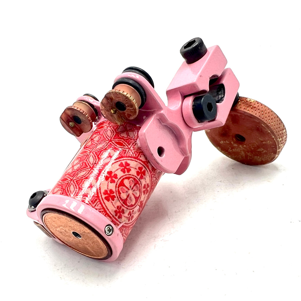 powder coated light pink with a red 4 leaf clover pattern wrapping the body. The brass hardware has been flash plated with copper and the the rear cap is machined canvas Micarta with a lucky penny (heads up) inset in to it. There’s a lot of work that went in to this one. It’s a special one for someone that either needs a little extra luck in their life or just wants all the luck they can get.